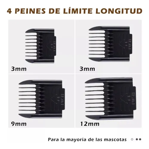 Viene con 4 accesorios de peine (3 mm, 6 mm, 9 mm, 12 mm), 1 peine y 1 tijeras (ambos de acero inoxidable), 1 cepillo de limpieza, 1 cable USB, y 1 cortaúñas, 1 lima de uñas hacen que sea más fácil y seguro de operar la máquina incluso para los nuevos usuarios, ideal para cortar el pelo de sus mascotas.